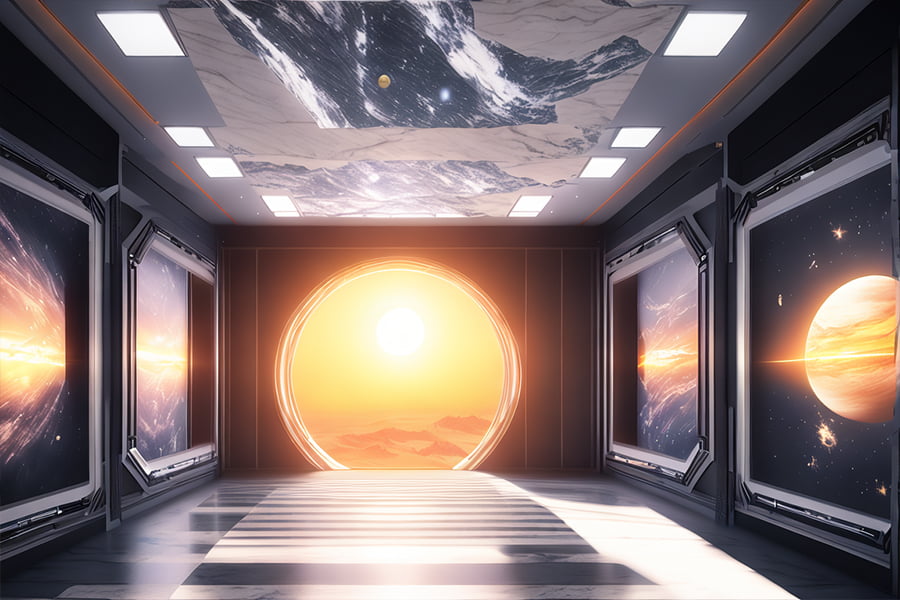 這個(gè)區(qū)域是天文科普館的入口,它將以宏大的設(shè)計(jì)元素迎接您,如一扇星際迷航之門。這個(gè)門的設(shè)計(jì)靈感來(lái)源于宇宙飛船的形狀,光滑的金屬質(zhì)感與星際之旅的冒險(xiǎn)氛圍相得益彰。燈光將以藍(lán)色和紫色為主,猶如星空中的繁星閃爍。多媒體設(shè)備將播放星際飛行的震撼畫面,展板上展示著星際迷航的歷史,雕塑則呈現(xiàn)著星際飛船的精巧細(xì)節(jié)。